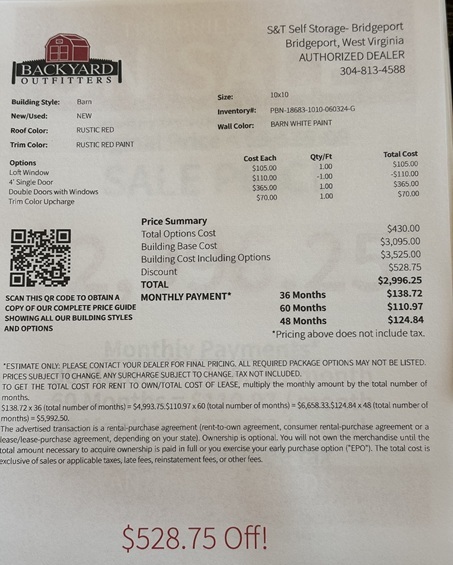 | Cash Price | $2,996.25 + tax after $528.75 OFF (15%) | |