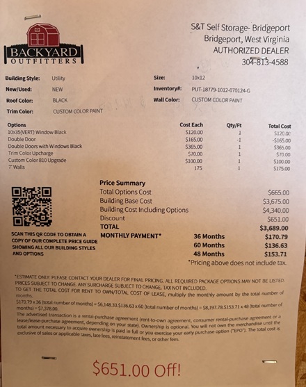 -7 Ft Walls -1(10×35) Window -Painted Trim -Custom Color UPG -Double Doors with windows | |