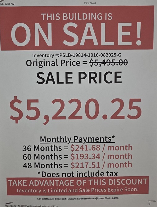 | Cash Price | $5,220.25 + tax after $274.75 (5%)OFF | |