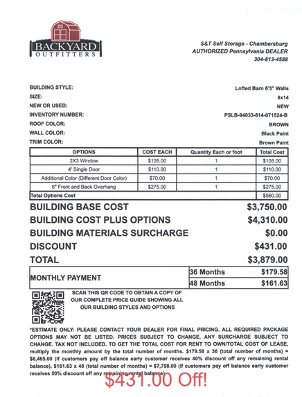 -1(2×3) windows -Door Trim Color -6″ Overhang | |