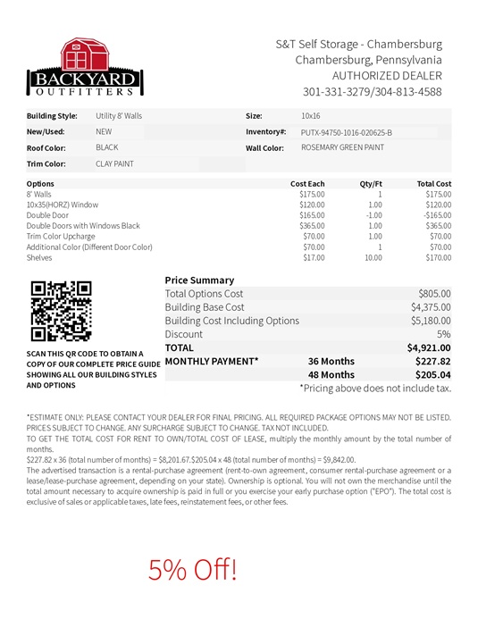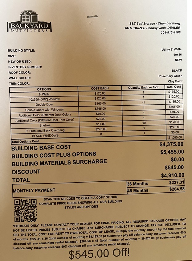 -8 Ft Walls -1 (10×35) Window -Add Door Color -Add Trim Color -Shelves -6″ Overhang -Black Windows -Double Doors with Windows | |