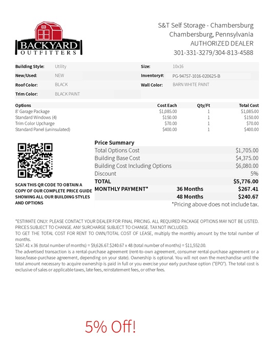 | Cash Price | $5,776.00 + tax after 5% OFF | |