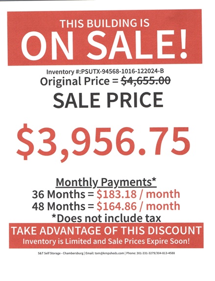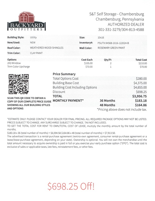 | Cash Price | $3,956.75 + tax after $698.25 OFF (15%) | |