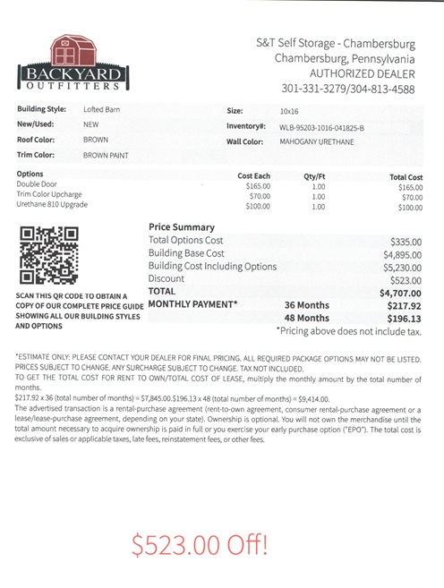 | Cash Price | $4,707.00 + tax after $523.00 OFF (10%) | |