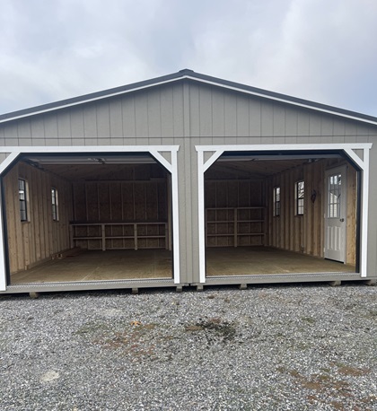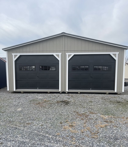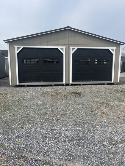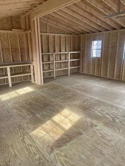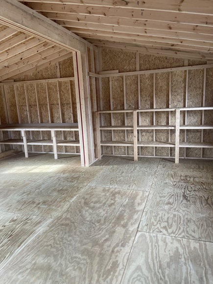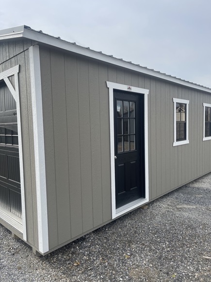 -8 Ft Walls -Workbench -Shelves -6″ Overhang -Trim Color UPG -5/8 Treated SquareEdge -Arched Stockton Glass -Black 9-Lite Door -Carriage House Panel | |
