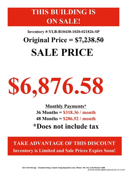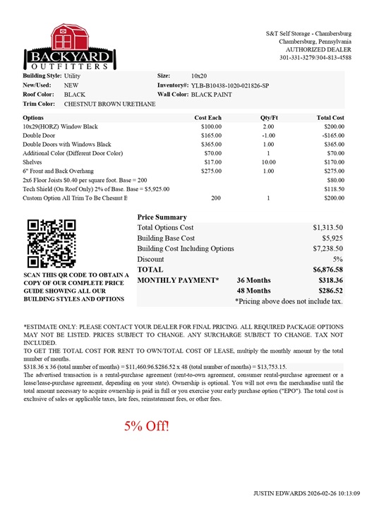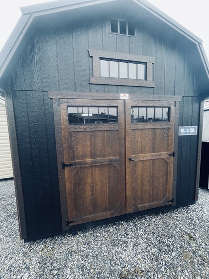 -2(10×29) Windows -Add Door Color -Shelves -6″ Overhang -2×6 Floor Joists -Tech Shield Roof -Chestnut Trim -Double Doors with Windows Black | |