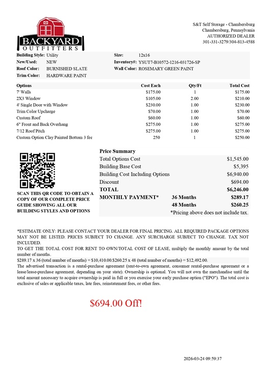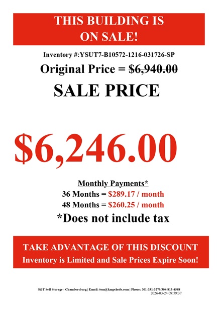 12×16 Utility Shed with 7 Ft Walls for sale in Chambersburg PA
