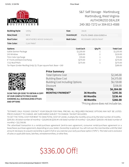 | Cash Price | $6,384.00 + tax after $336.00 OFF (5%) | |