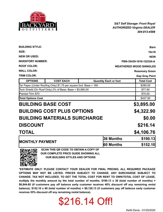 10×16 Mini-barn $4,106.76 plus tax after $216.14 Off(5%) Or Monthly payments as low as $152.10 plus tax. #rivertoncommons #frontroyal #newlocation #shedsforsale #shedsnearme #sheds #checkers