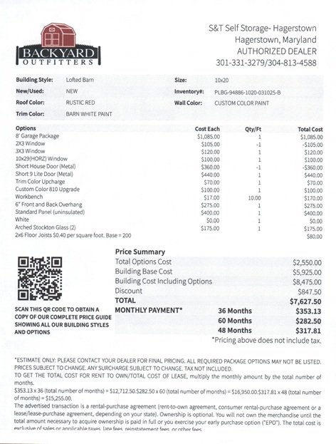 -8 Ft Garage PKG -1(3×3) Window -1(10×29) Window -Door Trim Color -Custom Color -Workbench -6″ Overhang -Arched Glass (2) -Standard Panel -Painted Trim -2×6 Floor Joists -Short 9 Lite Metal Door | |