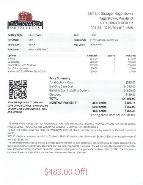 | Cash Price | $4,401.00 + tax after $489.00 OFF (10%) | |
