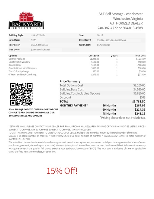 – 7 ft Walls – Dormer PKG – 6″ Overhang -10×35(HORZ) window -Double Door with windows | |