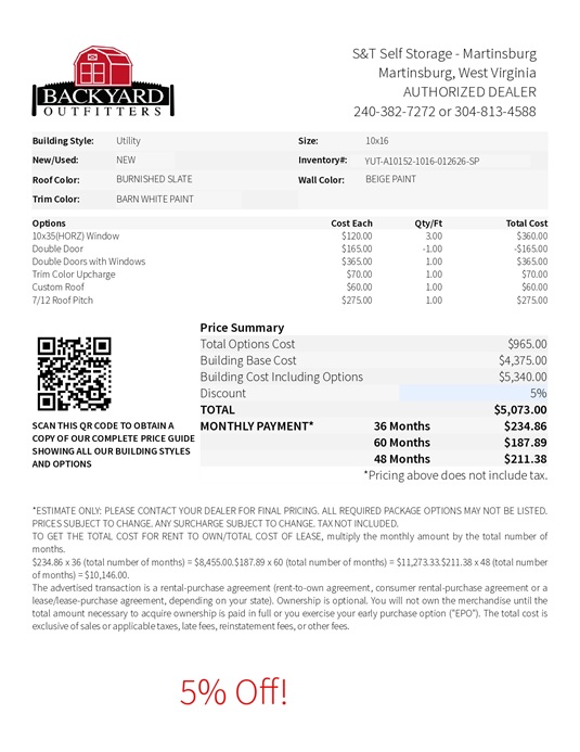 | Cash Price | $5,073.00 + tax after 5% OFF | |