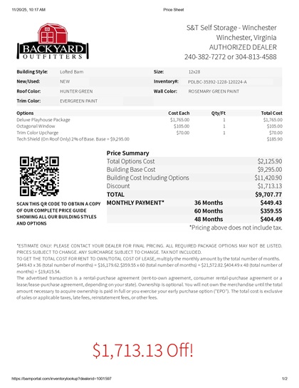 | Cash Price | $9,707.77 + tax after $1,713.13 OFF(15%) | |