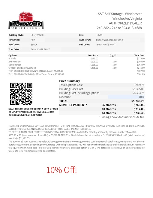 -8 Ft Walls -Double Door -6″ Overhang -Tech Shield Walls -Tech Shield Roof -Custom Urethane -1(2×3) Window w/ Shutter Trim | |