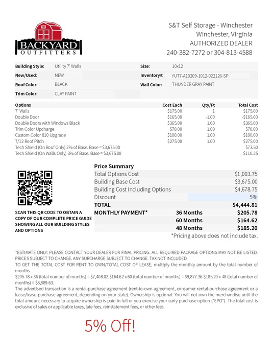 -7 Ft Walls -Add Trim Color -Tech Shield Roof -Tech Shield Walls -Custom Color Upgrade -7/12 Roof Pitch -Double Door with Windows Black | |