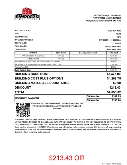 -6″ Overhang -7/12 Roof Pitch -Tech Shield Roof -Tech Shield Walls -Painted Trim | |